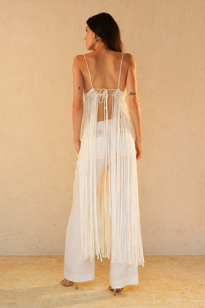 Bata off-white com detalhe superior em macramê e franjas longas, trazendo leveza, movimento e um toque boho sofisticado. Possui alças finas e caimento fluido, ideal para looks de verão, praia ou produções casuais com estilo. Uma peça marcante, moderna e perfeita para quem ama autenticidade.