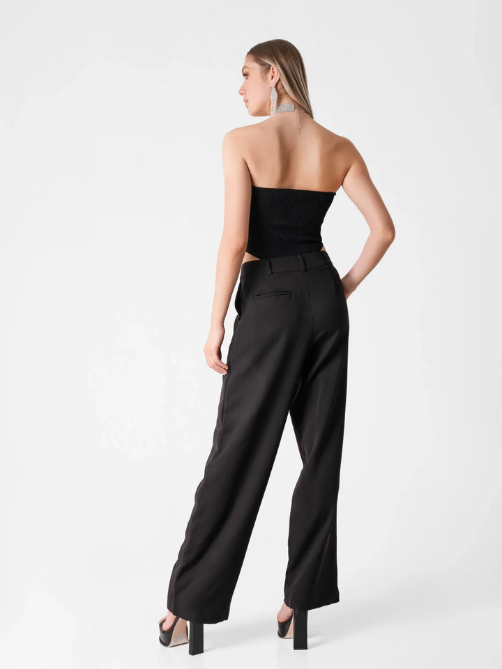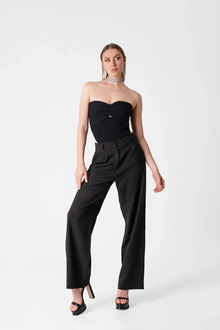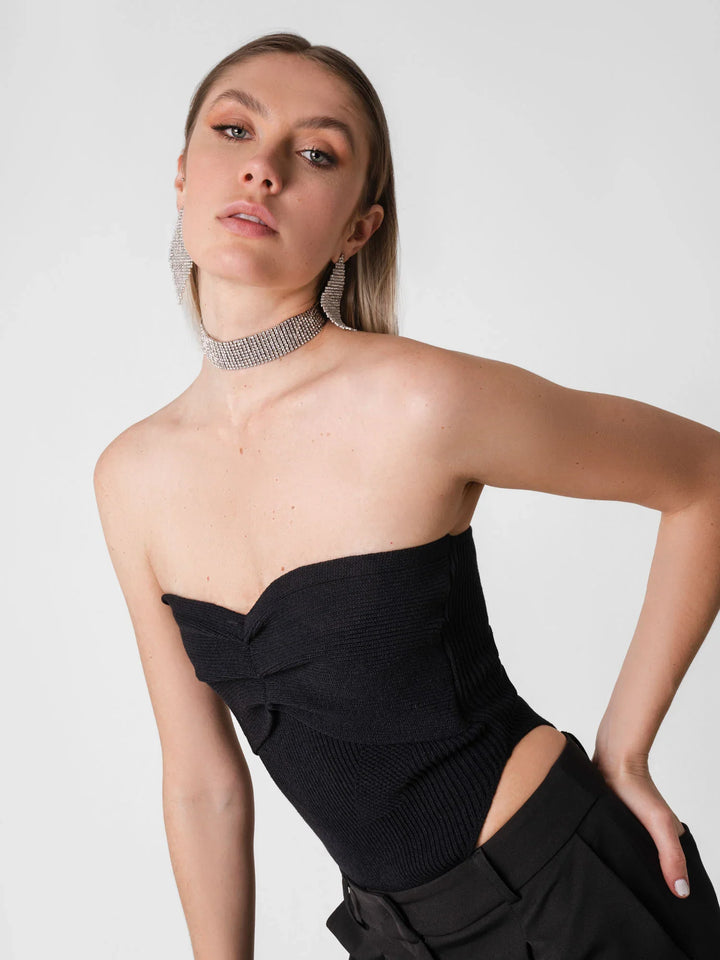 Body em tricot canelado tomara que caia com top franzido e lateral cavada. Possui fechamento inferior por colchetes.