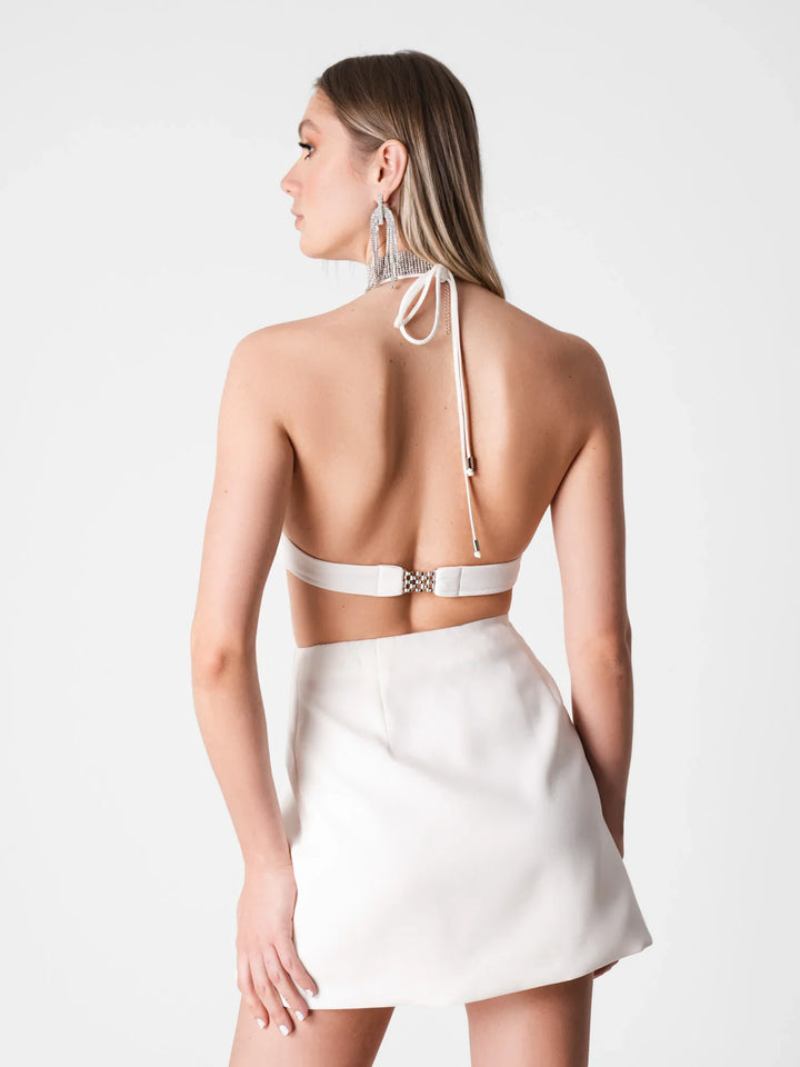 Top em alfaiataria liso com amarração no pescoço e fechamento por fivela de metal nas costas.