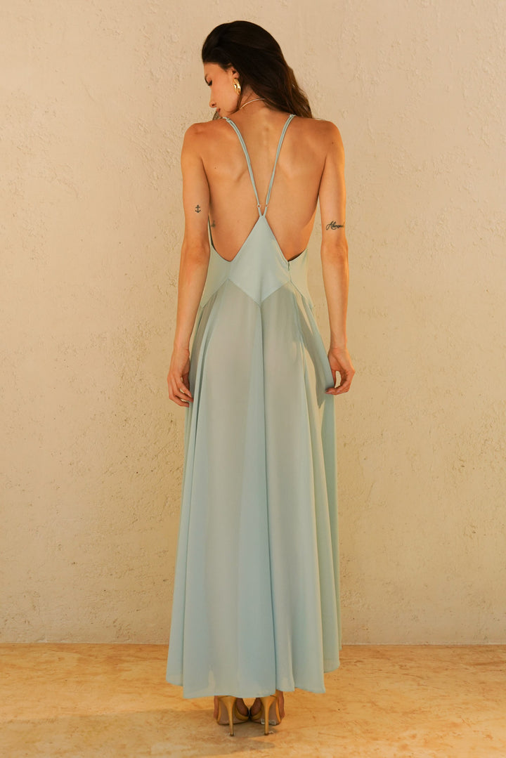 Vestido longo verde menta com alças finas e decote em “V”, trazendo um visual delicado e feminino.