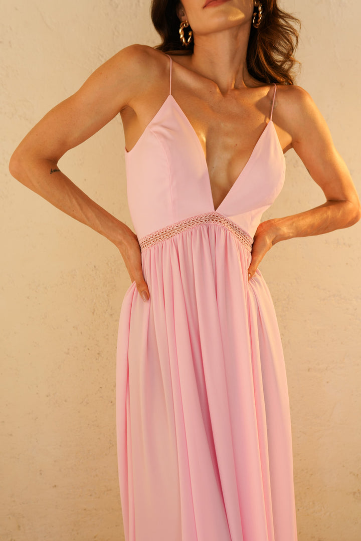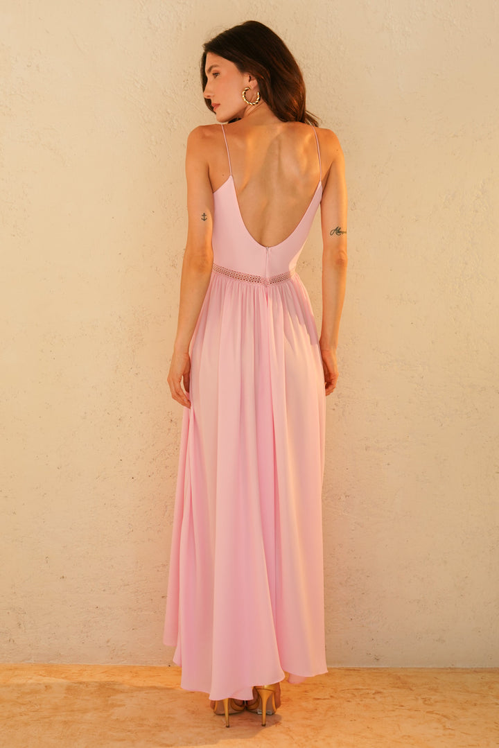 Vestido longo em tom rosa claro, com alcinhas finas e decote em V que valoriza o colo com delicadeza. Possui detalhe em renda vazada na cintura, realçando a silhueta de forma sutil e feminina. A saia fluida e com bom caimento traz leveza e movimento à peça. Um modelo romântico e elegante, perfeito para ocasiões especiais, jantares ou eventos ao ar livre.