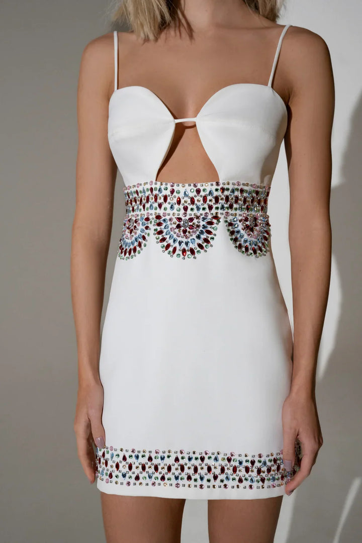 Vestido Lasai. Peça curta de alfaiataria, modelagem estruturada, decote com alças finas. Bordado com pedrarias, possui recortes abaixo do busto.