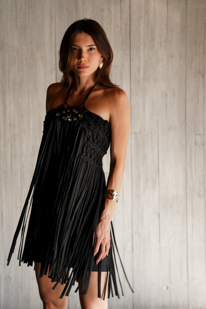 Produzido com fio de malha e tecnica de macramê, modelagem reta e finalizado com franjas.
